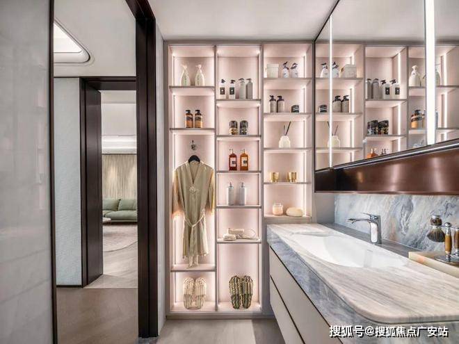 在主卫区域,建发直接用了一面墙的区域打出一个薄柜,设计了大小不一的壁龛,大到挂放浴袍睡衣,小到能摆放耳环戒指,方便日常的贴心取用。