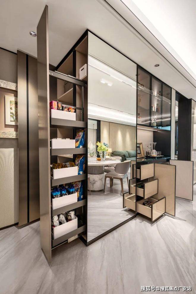 顶柜上方一面镜子,能让你清楚知道柜子里有无遗漏物品;卫生间台盆下方,特意为扫地机预留了空间;针对高处拿取物品难题,特意配置了下拉柜;针对转角深处取物,配置了转角联动抽拉组件……